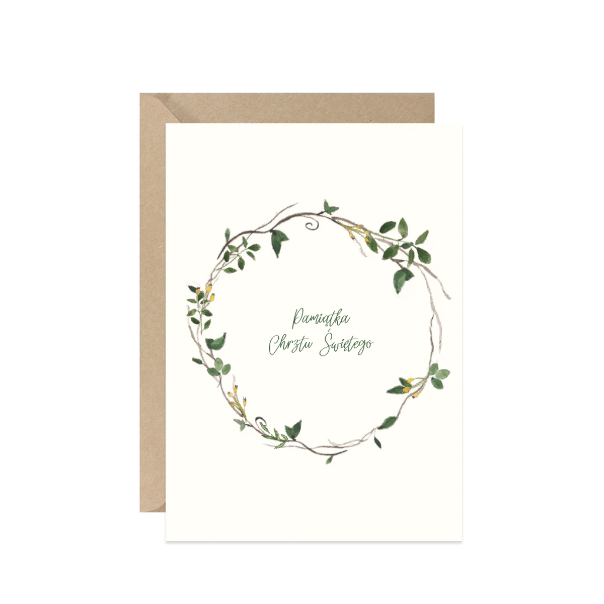 Piękna kartka z wiankiem wiosennym i napisem Pamiątka Chrztu Świętego - doskonała dla chłopca i dziewczynki jako wspomnienie tego ważnego dnia. Kartkę zdobi reprodukcja ręcznie malowanej akwareli.