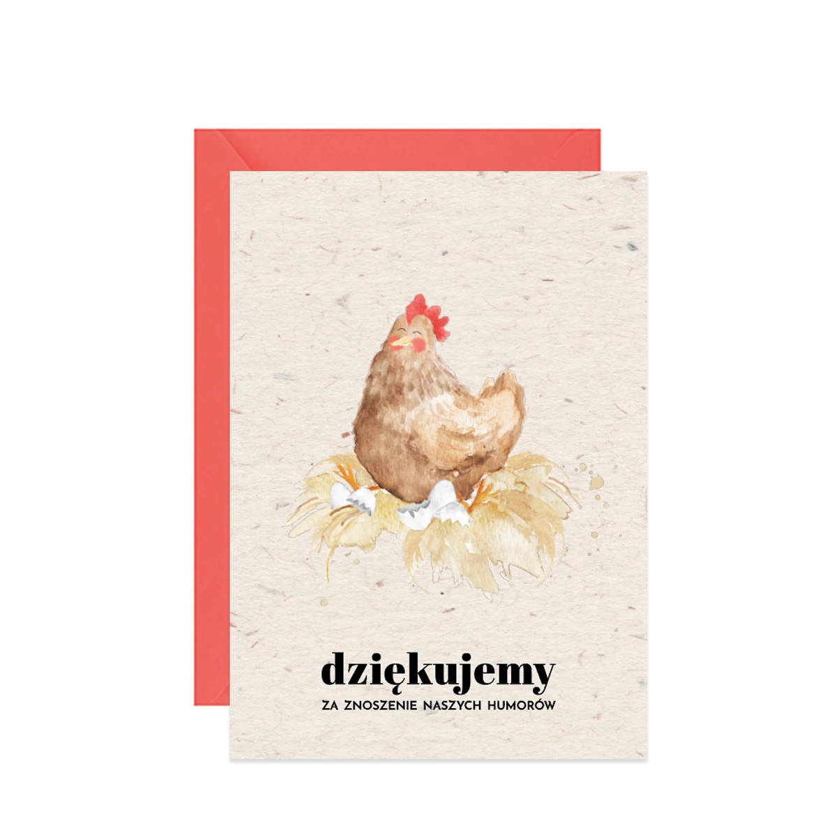 Dowcipna kartka z podziękowaniami dla rodziców, nauczycieli i innych bliskich z reprodukcją ręcznie malowanej akwareli - kurą i napisem Dziękujemy, za znoszenie naszych humorów!
