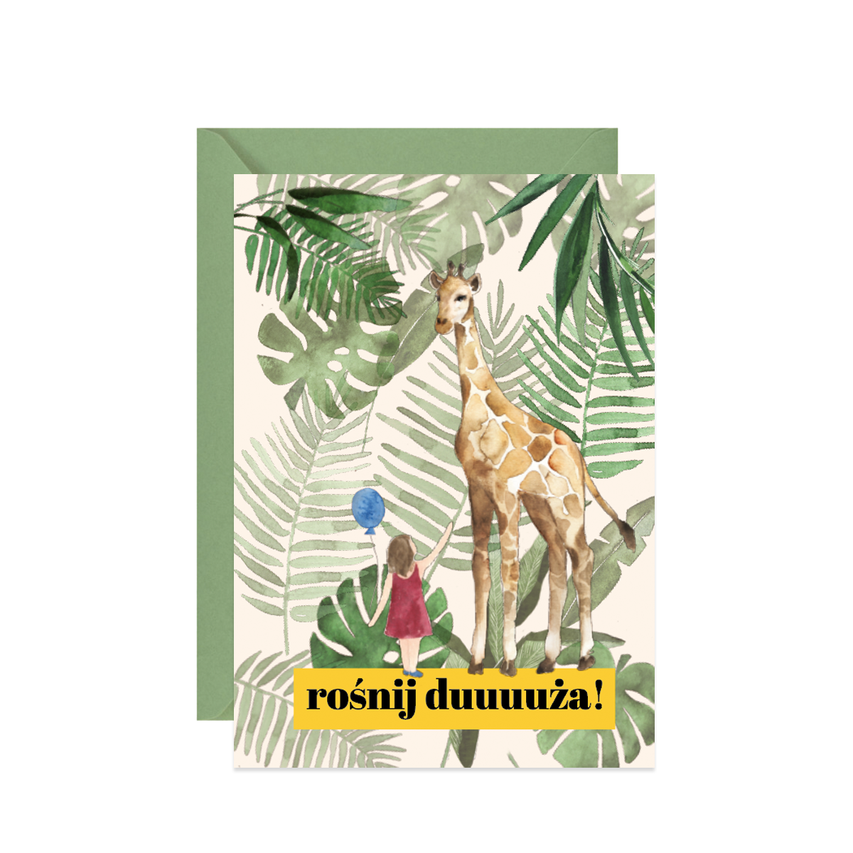Kartka z życzeniami dla Dziewczynki z reprodukcją ręcznie malowanej akwareli i napisem Rośnij duża! Zaprojektowana i wydrukowana w Polsce, na papierze z recyklingu.