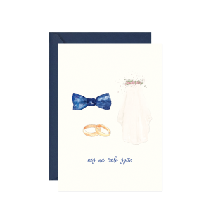 Piękna kartka z życzeniami na ślub z reprodukcją ręcznie malowanej akwareli - minimalistycznymi akcentami ślubnymi: welonem, muchą i obrączkami oraz napisem Raz na całe życie. Zaprojektowana i wydrukowana w Polsce, na papierze z recyklingu.