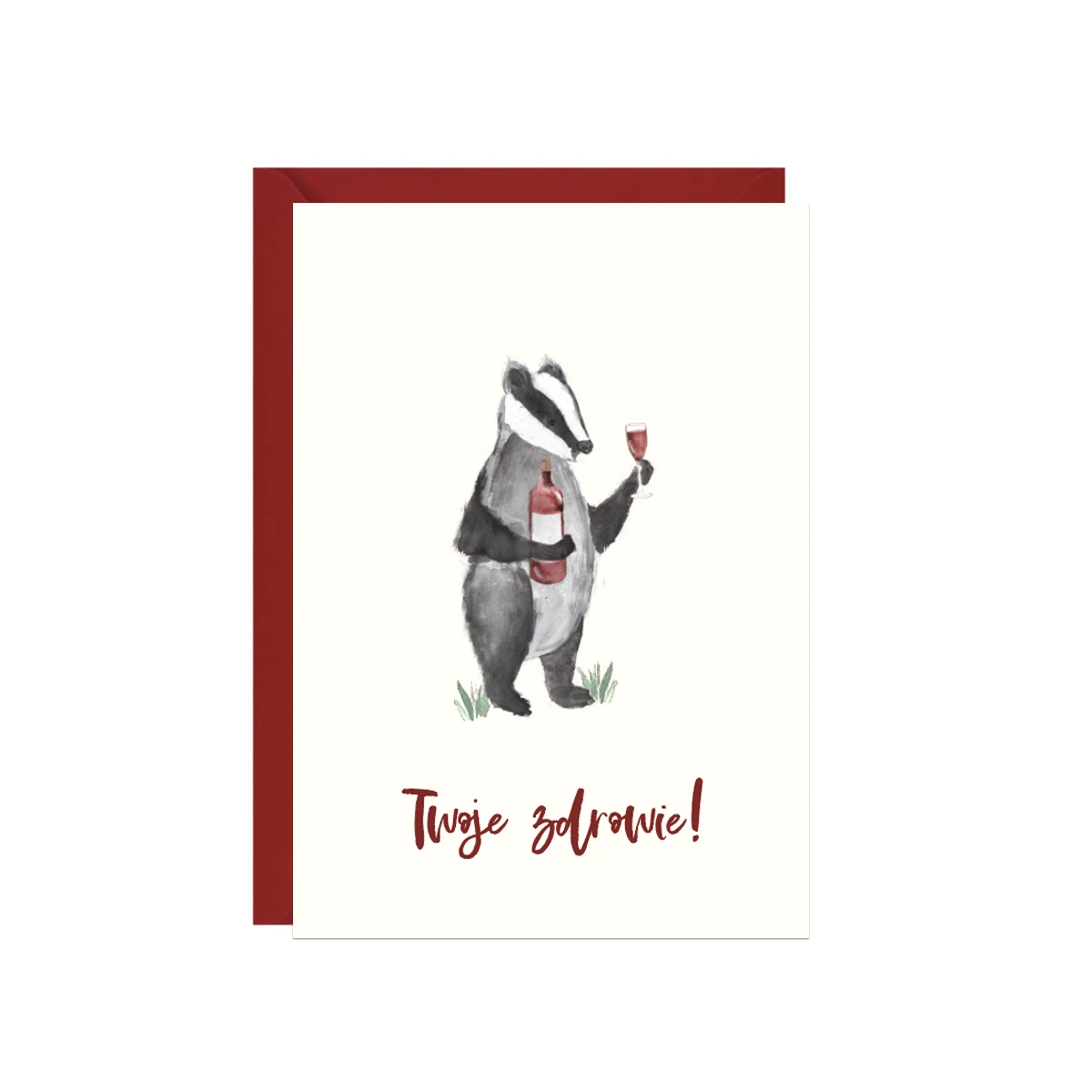 Kartka z życzeniami na urodziny z reprodukcją ręcznie malowanego akwarelą borsuka z butelką wina (lub zakwasu z buraków ;)) i napisem Twoje zdrowie! Zaprojektowana i wydrukowana w Polsce, na papierze z recyklingu.