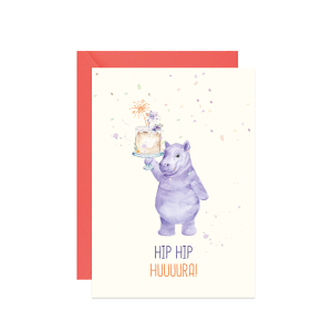 Kartka z życzeniami na urodziny z reprodukcją ręcznie malowanego akwarelą hipopotama i napisem Hip hip hurra! Zaprojektowana i wydrukowana w Polsce, na papierze z recyklingu.