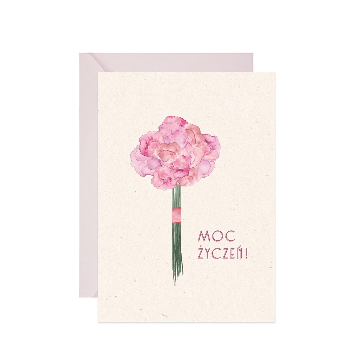 Kartka z reprodukcją akwarelowych kwiatów i napisem Moc życzeń, doskonała na życzenia urodzinowe, ślubne i inne piękne okazje dla bliskich Ci osób.
