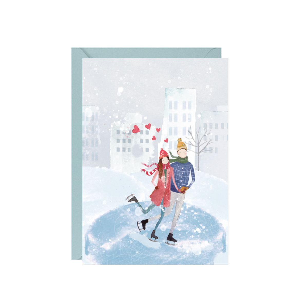 Kartka z parą na lodowisku, doskonała na zimowy ślub, Walentynki i inne miłosne okazje.