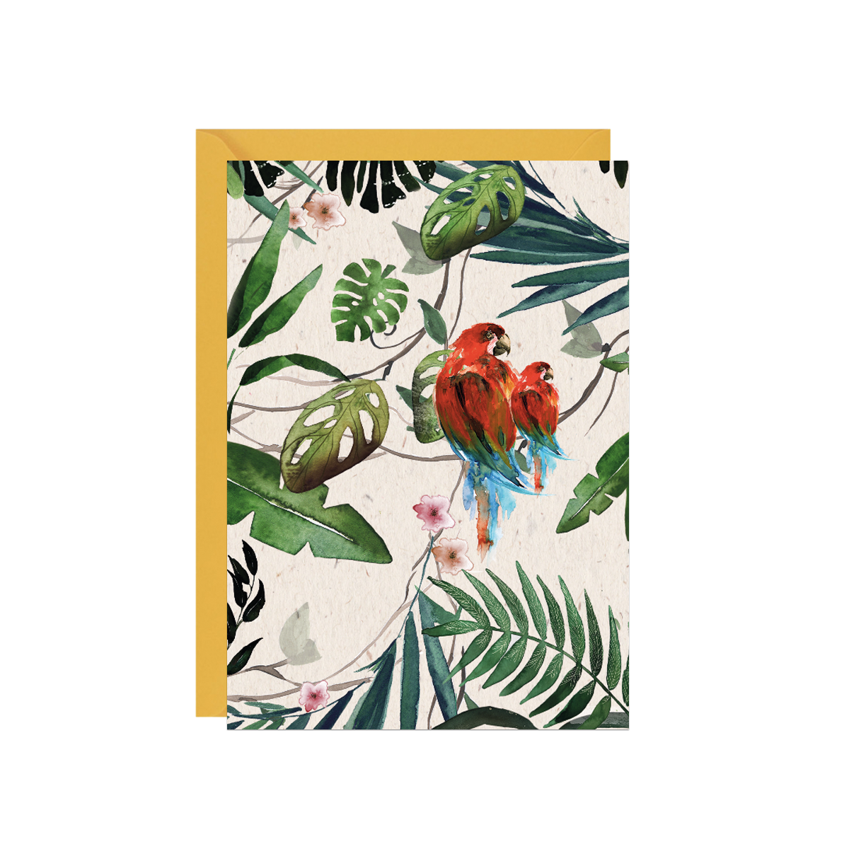 Kartka z akwarelowymi papużkami, ornitologicznie rzecz biorąc, wcale nie klasycznymi nierozłączkami. Ale my dobrze wiemy swoje: zakochane świata poza sobą nie widzą, przesiadując w gorących liściach tropików.
