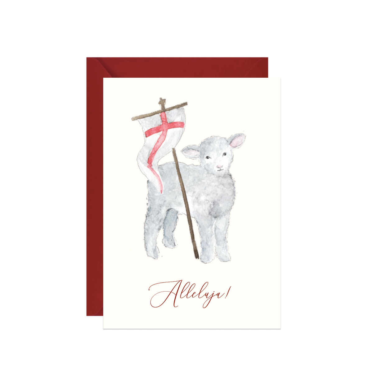 Kartka z wielkanocnymi życzeniami i reprodukcją ręcznie malowanej ilustracji - Zmartwychwstałego Baranka z napisem Alleluja - sprawi radość bliskim w skrzynce pocztowej obok sterty rachunków albo będzie miłym dodatkiem do drobnego upominku.