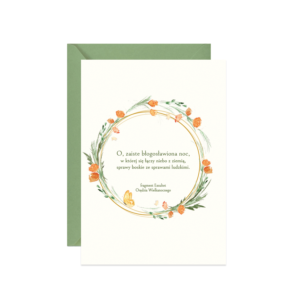 Kartka z wielkanocnymi życzeniami i reprodukcją ręcznie malowanej ilustracji - wiosennego wianka z fragmentem Orędzia Wielkanocnego - sprawi radość bliskim w skrzynce pocztowej obok sterty rachunków albo będzie miłym dodatkiem do drobnego upominku.