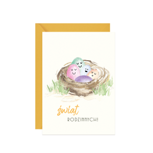 Kartka z wielkanocnymi życzeniami i reprodukcją ręcznie malowanej ilustracji - wesołą rodzinką pinek i napisem Świąt rodzinnych! - sprawi radość bliskim w skrzynce pocztowej obok sterty rachunków albo będzie miłym dodatkiem do drobnego upominku.