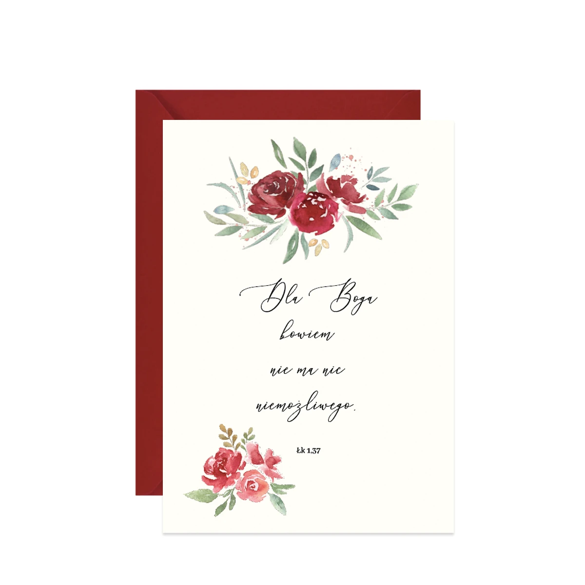Kartka z reprodukcją ręcznie malowanej akwareli - delikatnymi kwiatami i cytatem Dla Boga nie ma bowiem nic niemożliwego. Sprawdzi się jako kartka z ze słowami otuchy na trudne okoliczności.