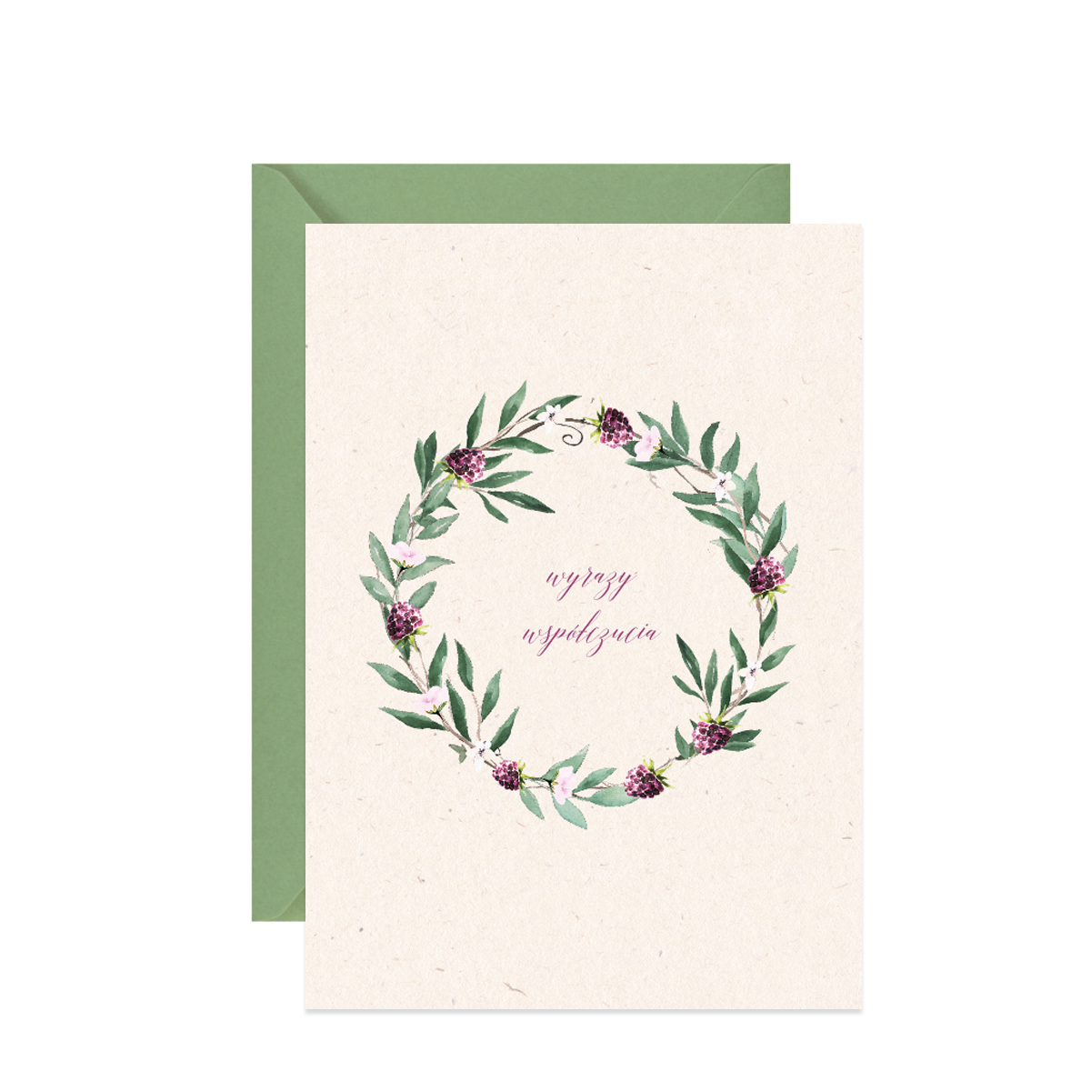 Kartka z akwarelowym, kwiatowym wieńcem i napisem "Wyrazy współczucia". Doskonała na kondolencje i słowa wsparcia po śmierci bliskiej osoby.