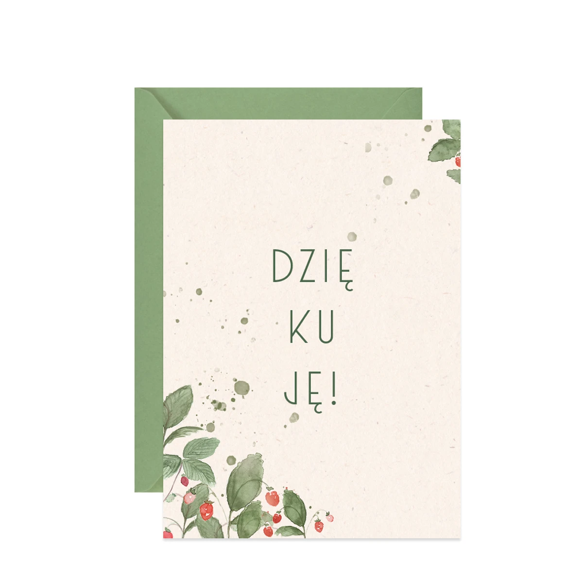 Kartka z reprodukcją akwarelowych poziomek i napisem Dziękuję, doskonała na podziękowania i życzenia dla bliskich Ci osób.