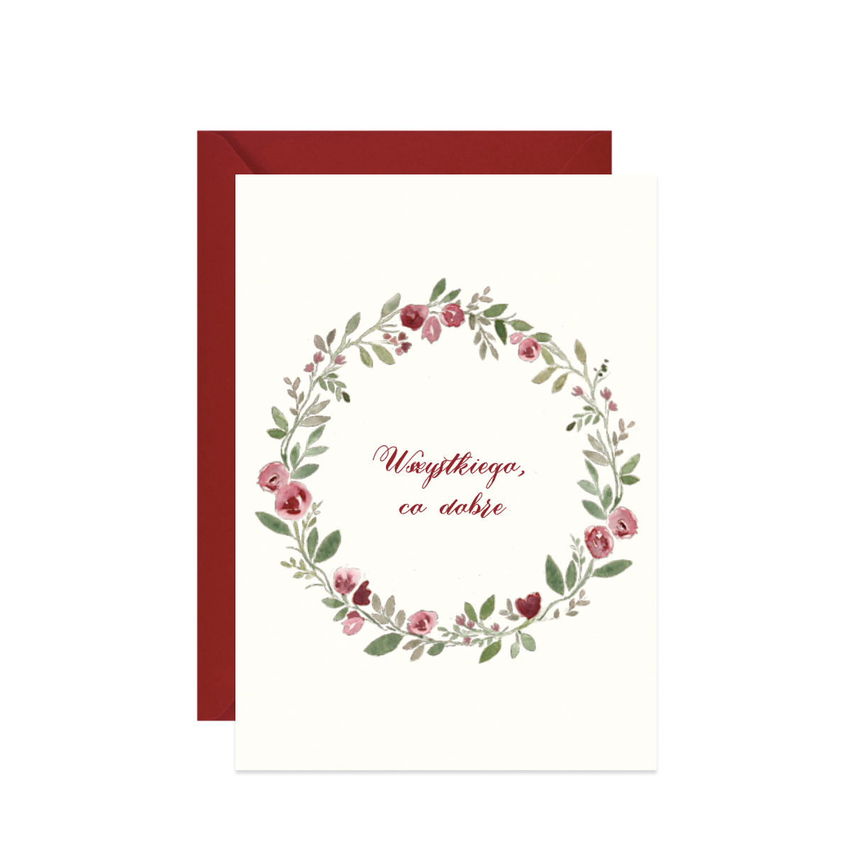 Kartka z akwarelowym, różanym wiankiem i napisem Wszystkiego, co dobre. Doskonała na życzenia z okazji urodzin, imienin, ciepłe słowo wsparcia. Sprawi radość bliskim w skrzynce pocztowej obok sterty rachunków.