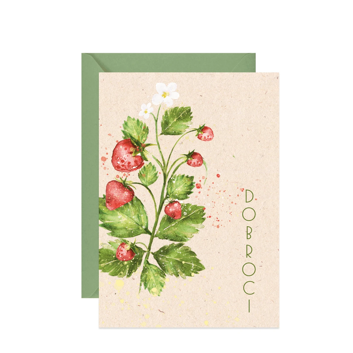 Kartka okolicznościowa polskiej produkcji z reprodukcją ręcznie malowanej akwareli przedstawiającej owoce truskawek z napisem Dobroci. Będzie doskonała na wiele okazji — od urodzin, przez ślub, zdany egzamin, czy awans w pracy.