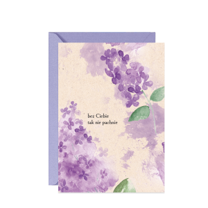 Kartka z reprodukcją akwarelowych kwiatów bzu i napisem Bez Ciebie nie pachnie tak samo. Będzie doskonała z okazji Dnia Mamy lub dla bliskiej osoby.