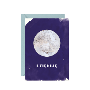 Księżycowa kartka z podziękowaniem z reprodukcją ręcznie malowanej akwareli - księżycem i napisem Dziękuję. Zaprojektowana i wydrukowana w Polsce, na papierze z recyklingu.