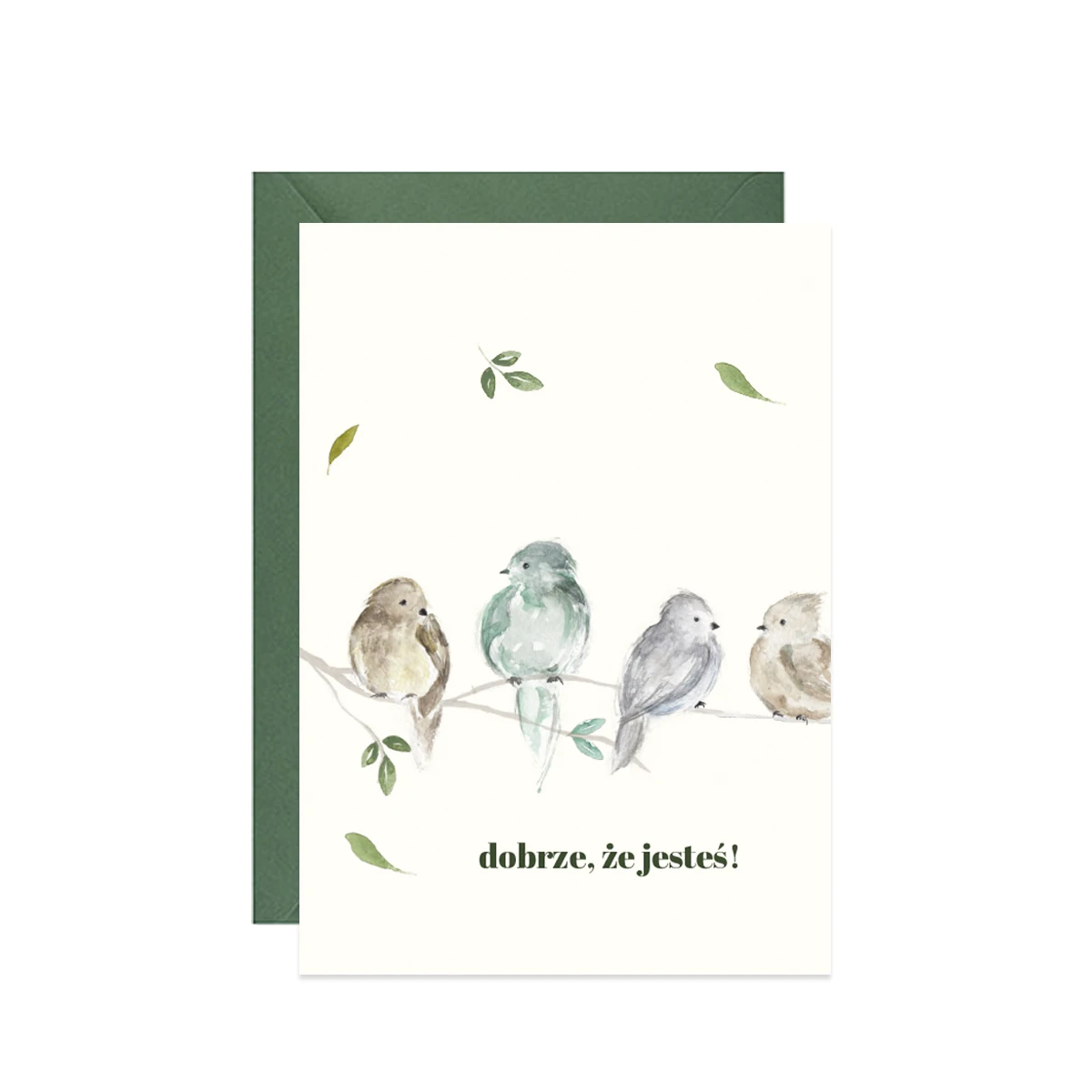 Kartka z życzeniami na wszelkie okazje z reprodukcją ręcznie malowanej akwareli - ptaszków i napisem Dobrze, że jesteś. Zaprojektowana i wydrukowana w Polsce, na papierze z recyklingu.